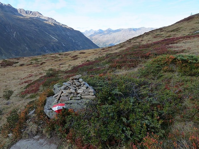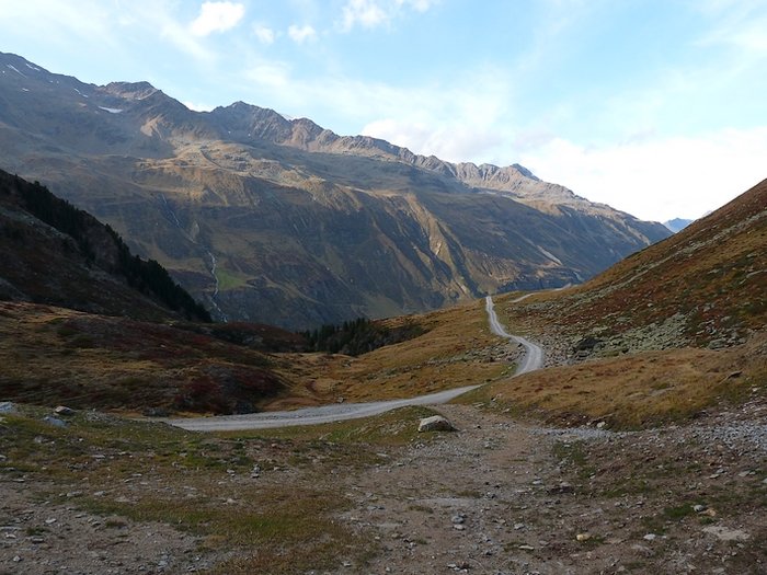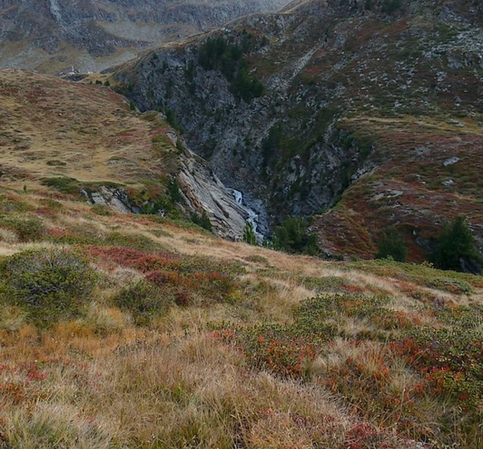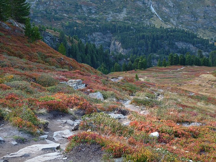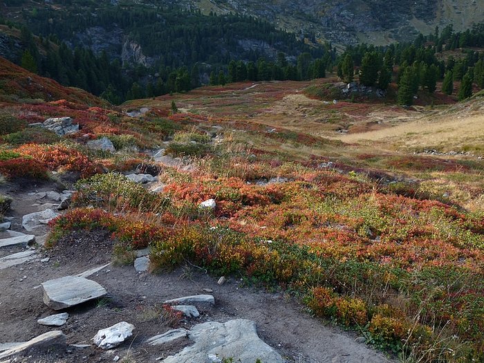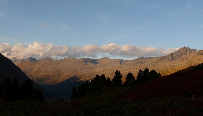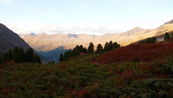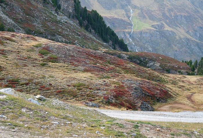 Having eaten my roll and checking the time on my mobile I lead a short but hefty discussion, if I should take the dirt track downwards or if I risked missing the bus at 7 pm not knowing how long it would take me to get down to Obergurgl via the hiking trail. If I missed that bus I would have to wait till late in the night for the last bus going downhill to Umhausen. And I had to pack and be up at 4 am the following morning. Well, you might have guessed it already, the enticing look of red blueberry bushes on the oposite side of the road won the unequal match.