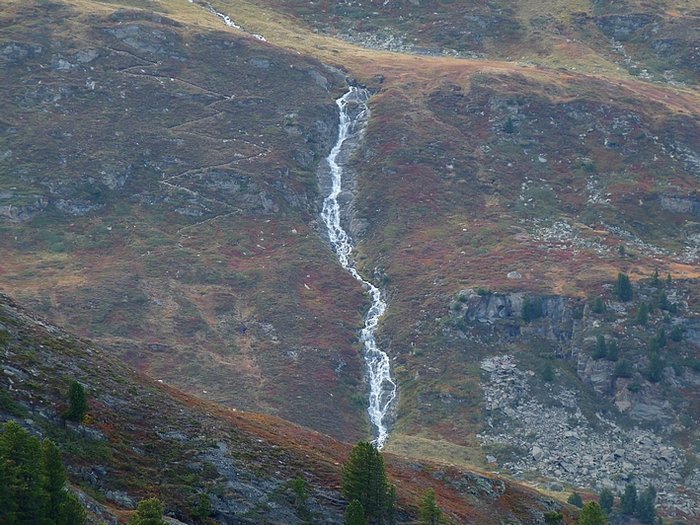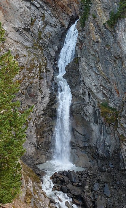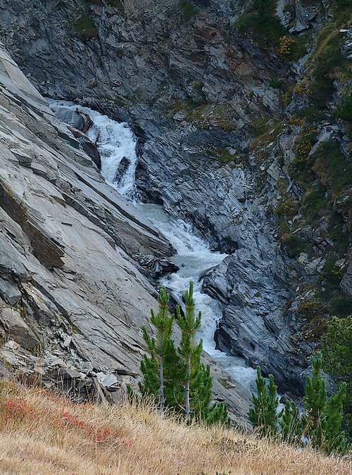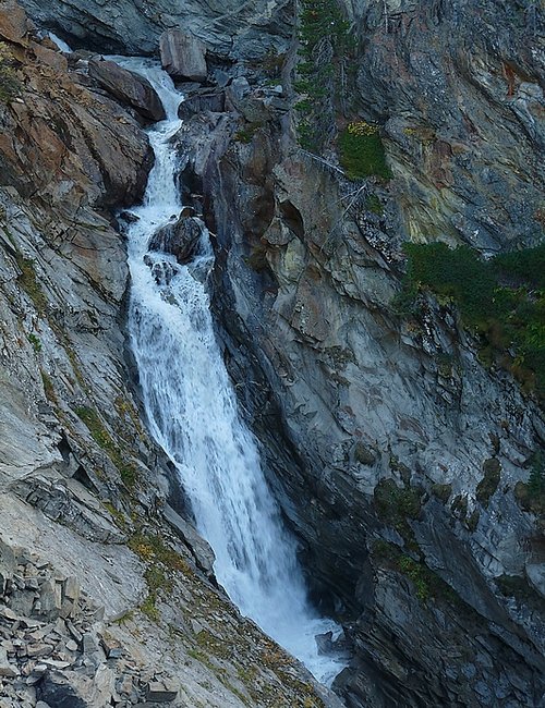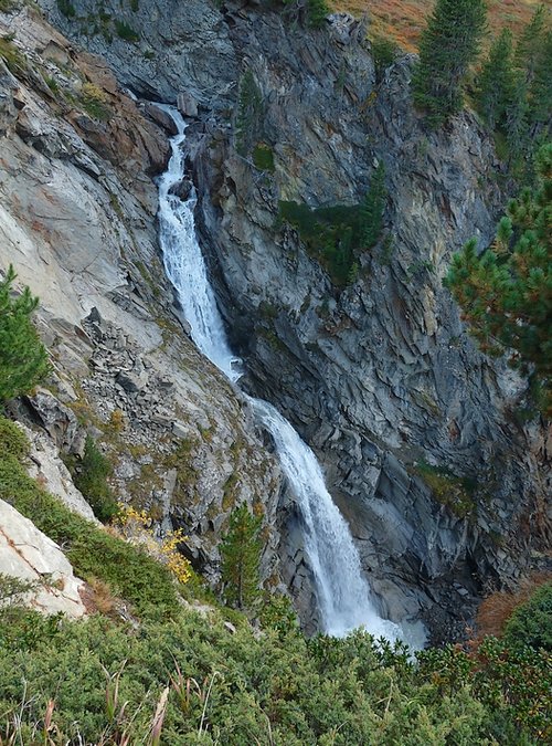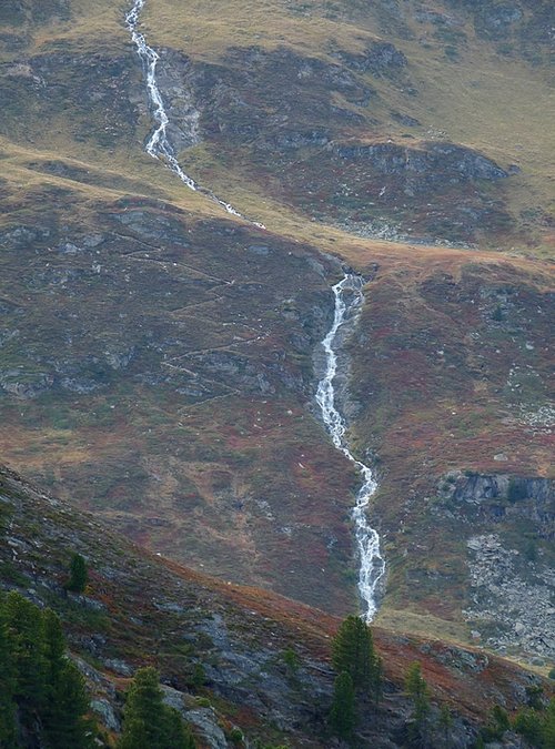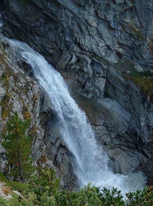 The second vista of the Rotmoos Falls held a surprise. Nothing along the path had prepared me for this sight of water falling free in two steps deep into a canyon. To get this view I had to stand close to the edge of the canyon without any rail between me and a drop of 80 to 100 metres. It was a bit scary standing there, but the view was simply breathtaking. The sound of thundering water echoed against the canyon walls.
