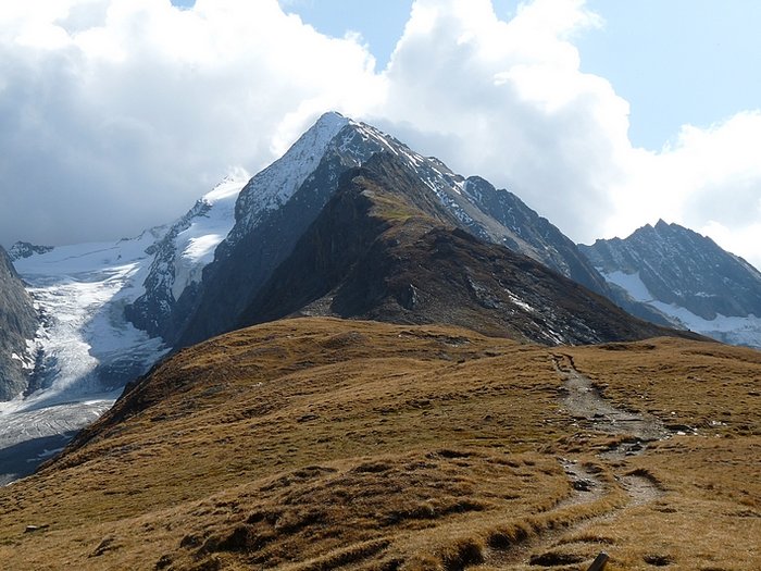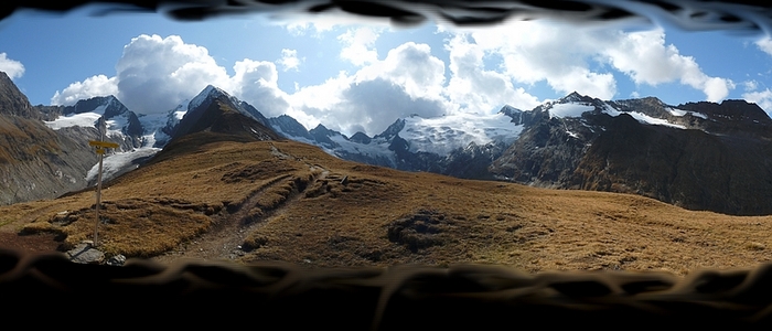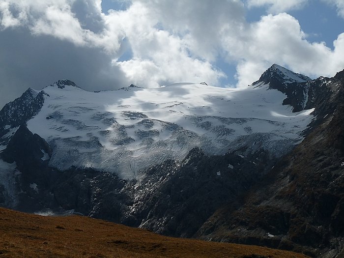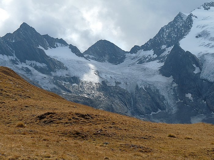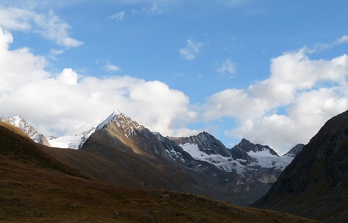 While eating my rolls and drinking some water I enjoyed the breathtaking outlook on ten peaks which were over 3000 metres high and a couple of others not much below that mark. From my point of rest I could look down into both the Gaisberg- and the Rotmoos valleys or turn around and have a glance on the magnificent mountains in my back. It felt like being in Paradise or like having found Walhalla: the place where the nordic gods dwelled and which could only be reached by crossing the rainbow. Truly I asked myself: "Could heaven be more beautiful?" It was hard to believe.