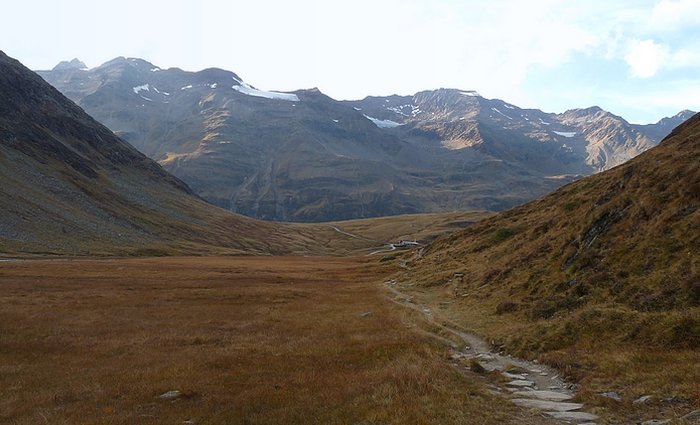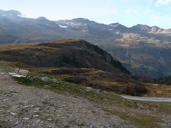 So I restricted myself to sitting on a bench at the pond and eating the last roll. It was already a little stale and the cheese dry at the edges, while drops of fat had formed on its surface. But did it matter? No! My senses were spilling over with marvel, that the taste of food no longer seemed important. I enjoyed the last look into the Rotmoos valley, before crossing the dirt track that led from the cabin down into Obergurgl.