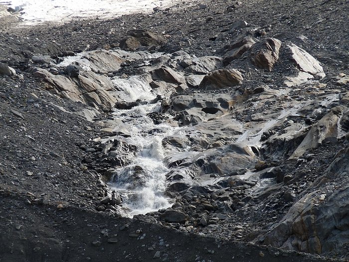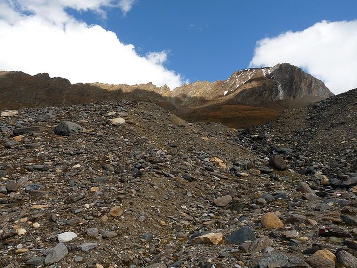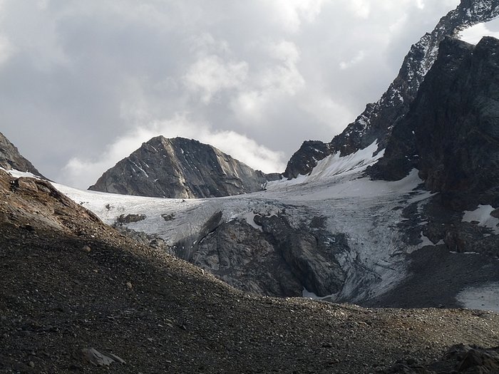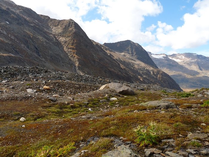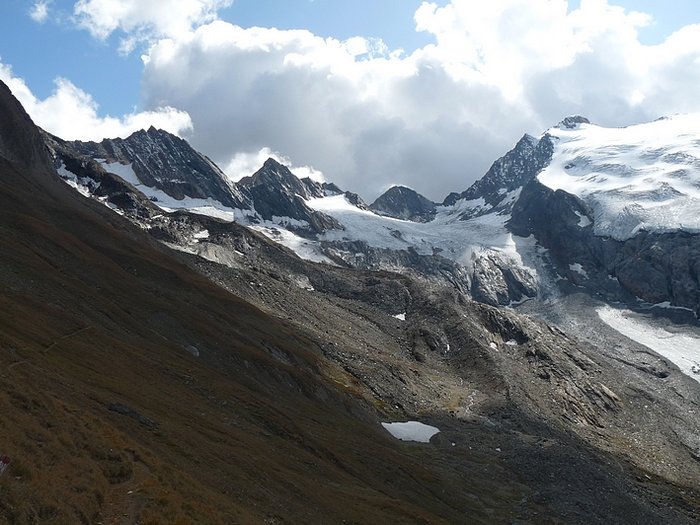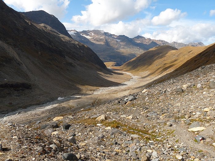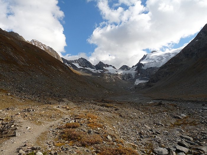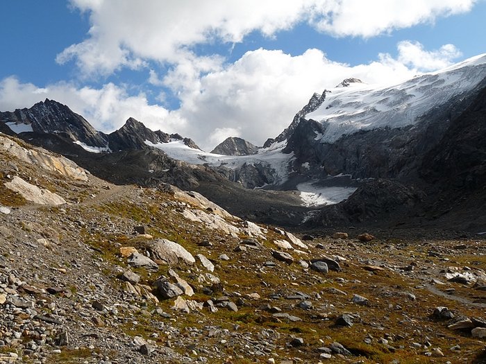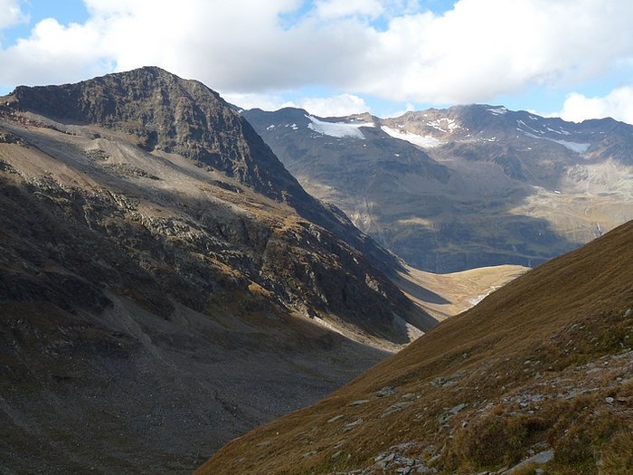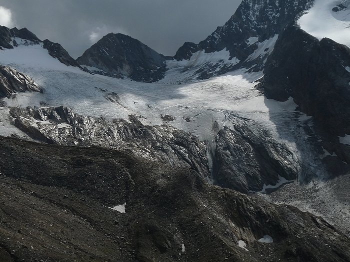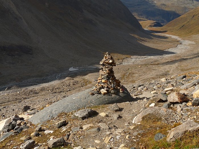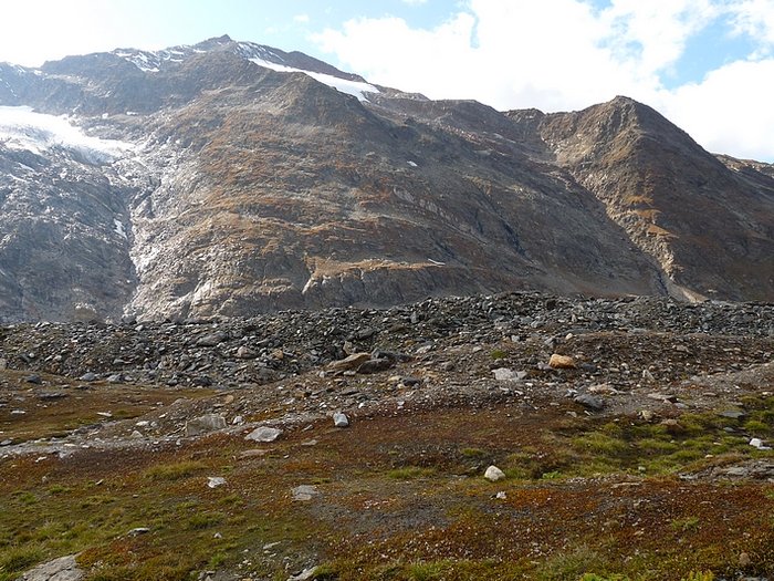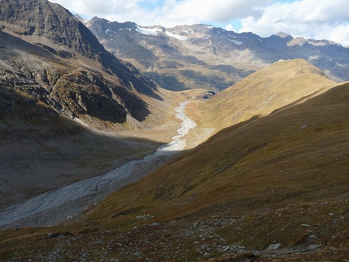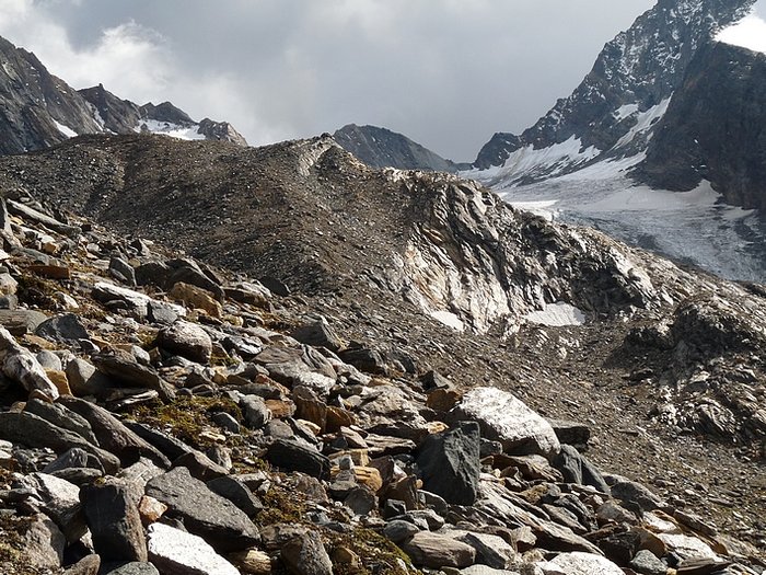 Here too the devastating signs of two retreating glaciers. On my map the Rotmoosferner on the left was splitting in two tongues at the ridge and running much further into the valley, being connected with the Wasserfallferner on the right hand side and reaching all the way down to the hiking trail. But in reality it didn't only a big moraine was left.