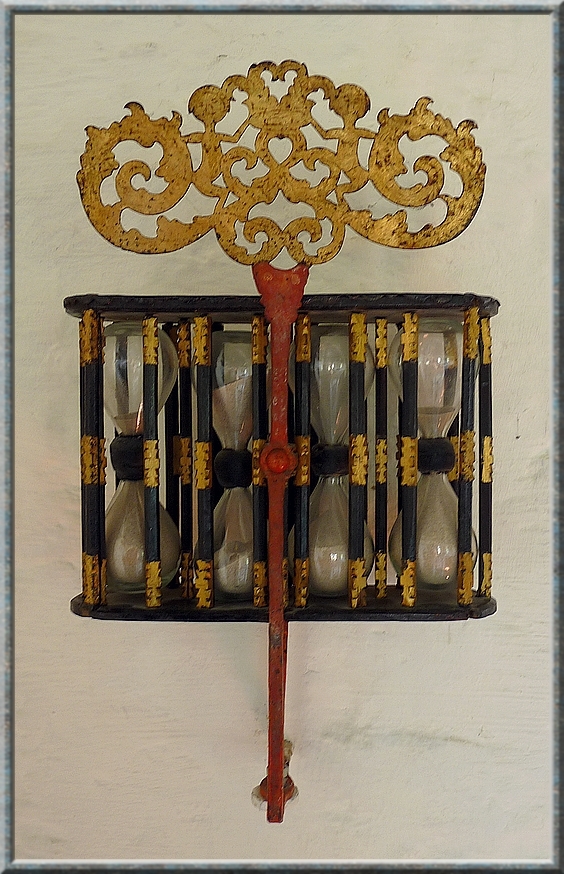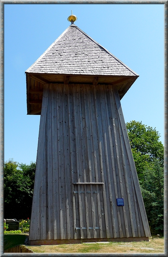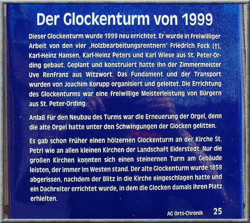 The wooden clock tower has been built in 1999 by four voluteering woodcraft pensioners from St. Peter-Ording: Friedrich Fock (+), Karl-Heinz Hansen, Karl-Heinz Peters and Karl Wiese. The carpenter Uve Renfranz of Witzwort was responsible for the planning and construction. The foundation and the transport was organized and led by Jochim Korupp. The raising of the clock tower was a volunteer masterstroke of citizens of St. Peter-Ording.
