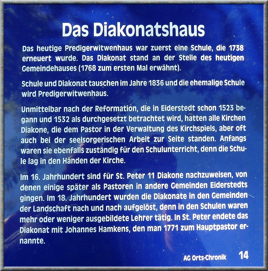 Immediately after the reformation, which started on Eiderstedt in 1523 and was deemed enforced by 1532, all churches had deacons which supported the parsons concerning the administration of the parish but often also by taking part in the pastoral care. At the beginning they were also responsible for the teaching as the school was being supervised by the church.
