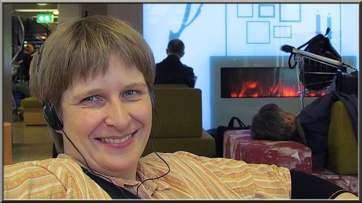 After a while my stomach requested a second breakfast, so we checked out the various snack bars. Nothing seemed to convince us, but sat down in a selfcatering sandwich bar fetching some soup and a mug of coffee and rested our feet at one of the last empty chairs. During our search for food we had discovered an interesting rest area, which we returned to after our meal. Lots of interesting sort of seets were to be found there. Some comfortable, others with integrated hifi system, some benches to stretch your legs and take a nap. On a screen they imitated a fireplace. A grandpiano stood in the center of this area and a few passengers sat down on the music stool and played a few songs. This place was a truly nice treat for those, who had to wait for a while. My sister slept and I listened to music till my cellphone told us that it was time to go to the gate. A nine-hour-flight was lying ahead of us.