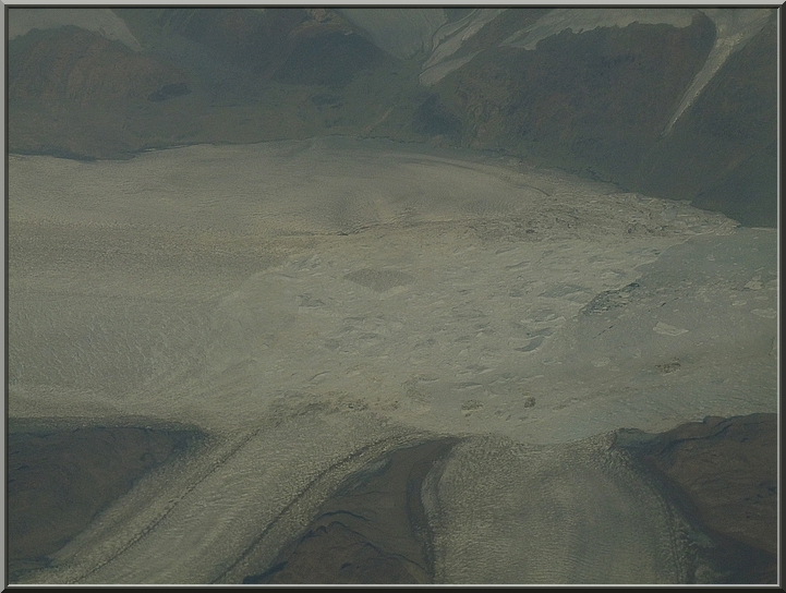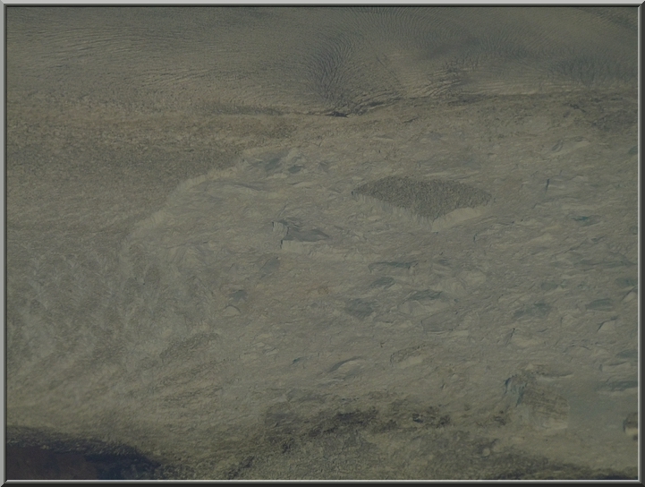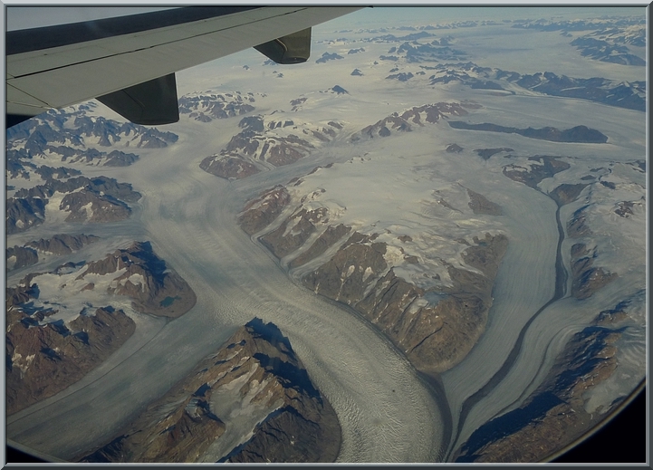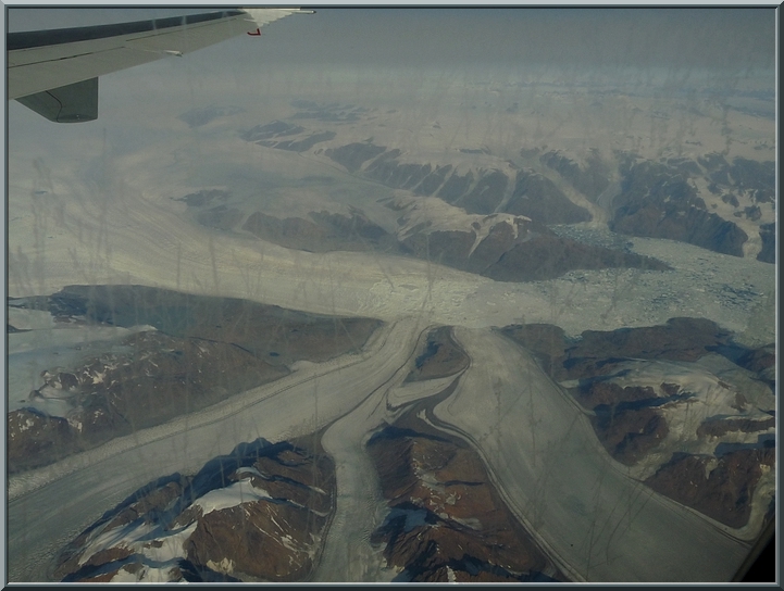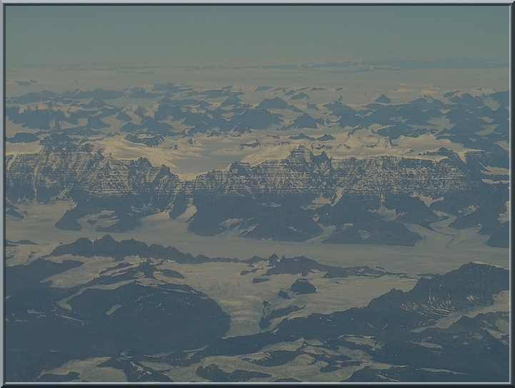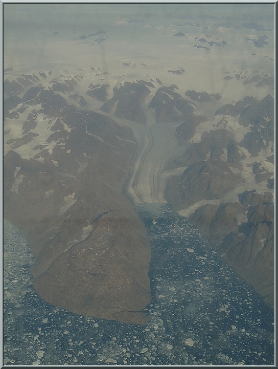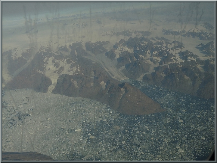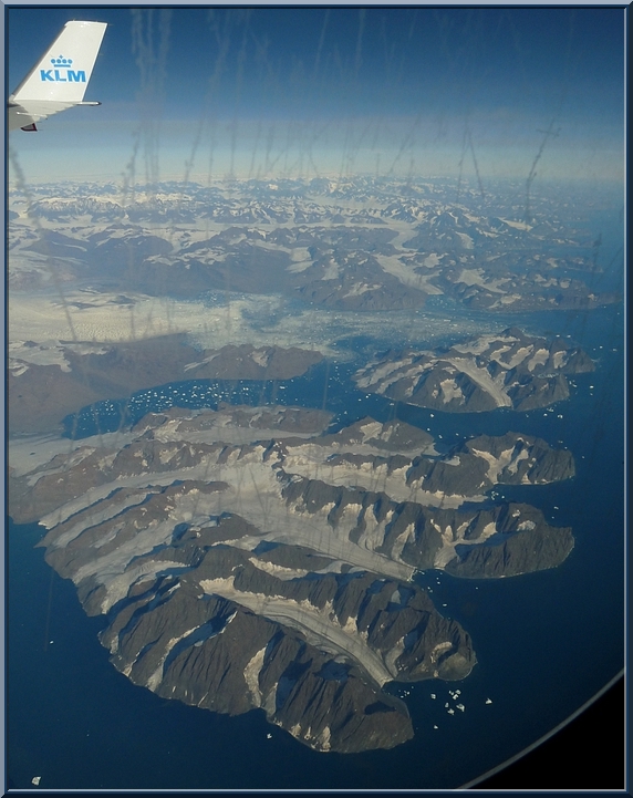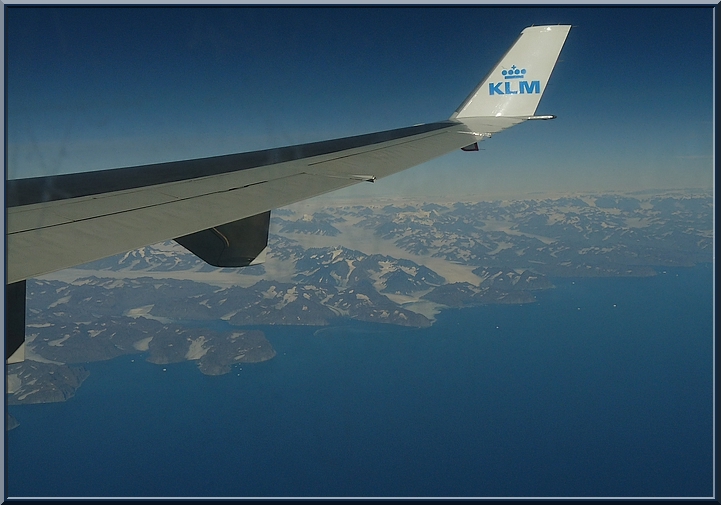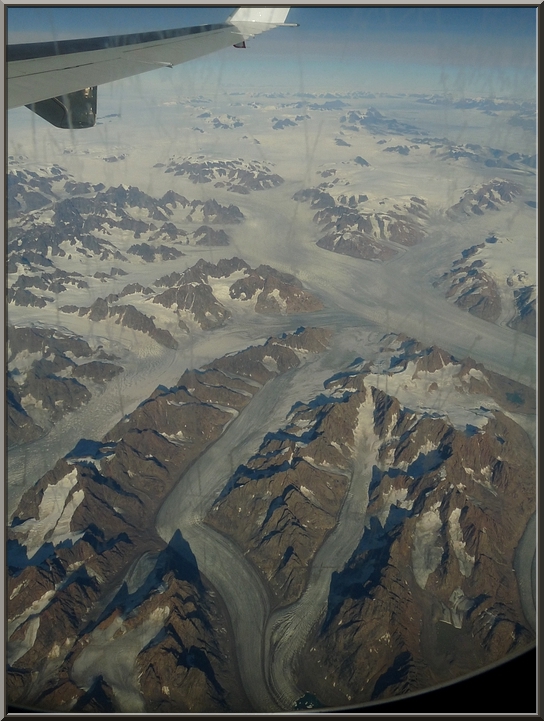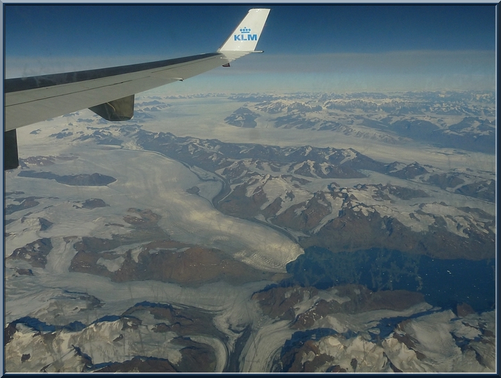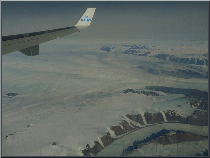 But the highlite of the flight was when the clouds were lessening and I could see the world below. After a short glimpse of Iceland followed a clear view on the snow world of Greenland. I love the polar regions, so the next hours turned out to be a fabulous sight-seeing flight for me. Vast glaciers topped bleak brown