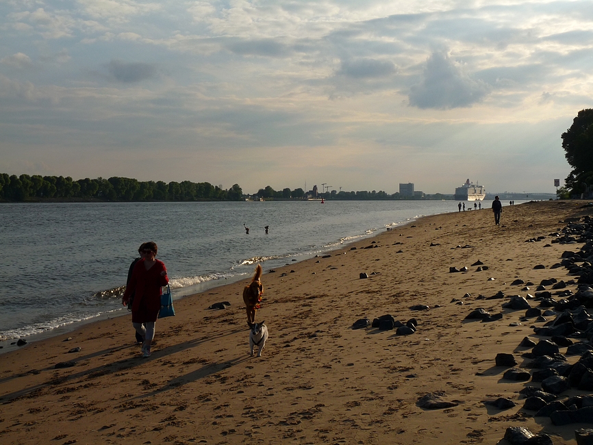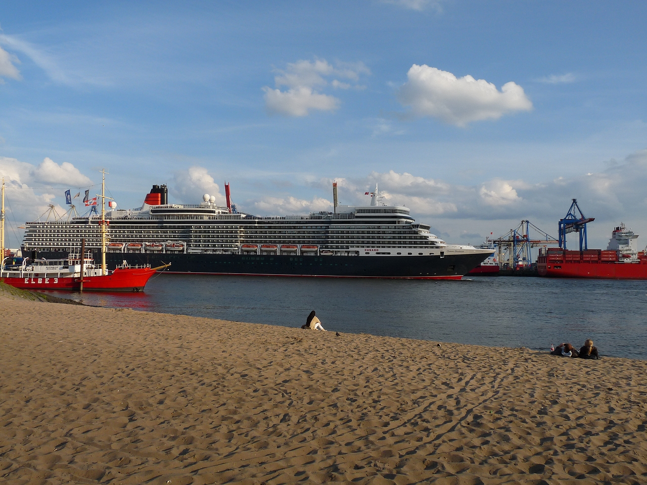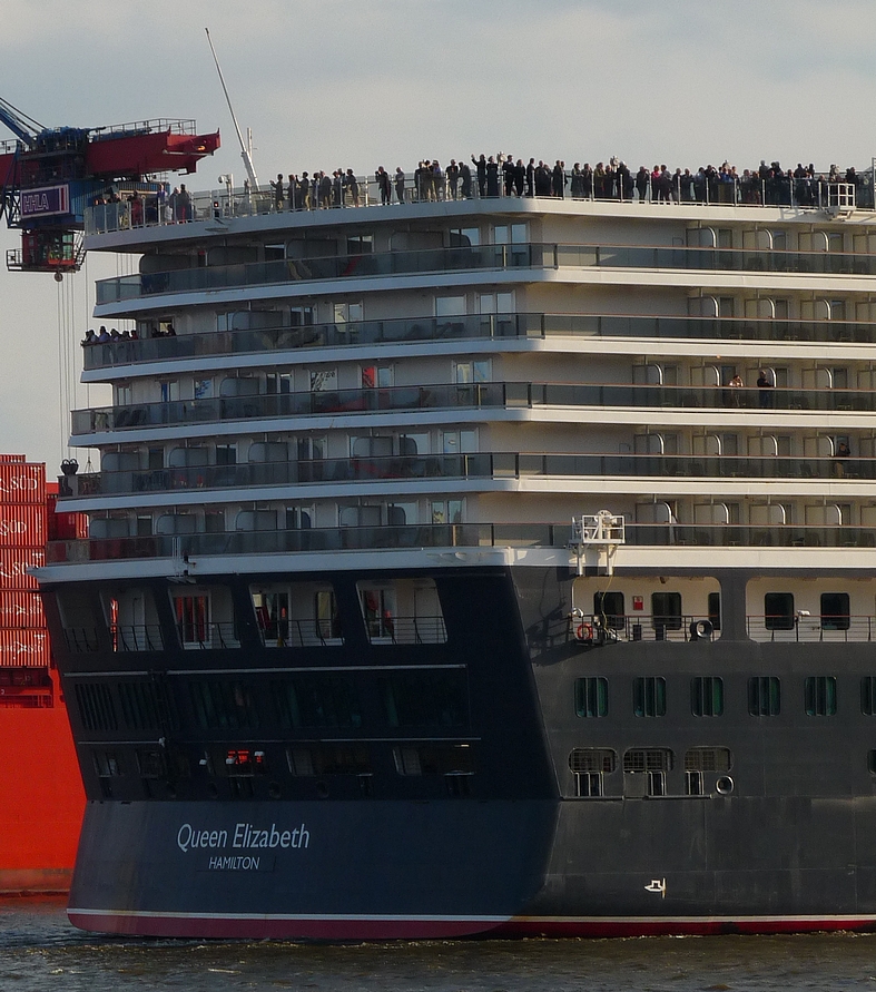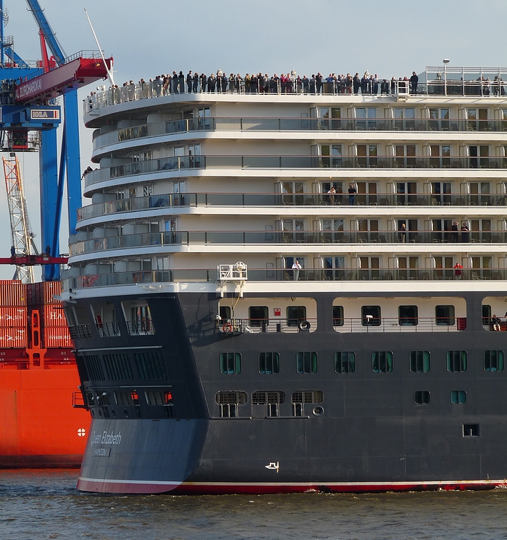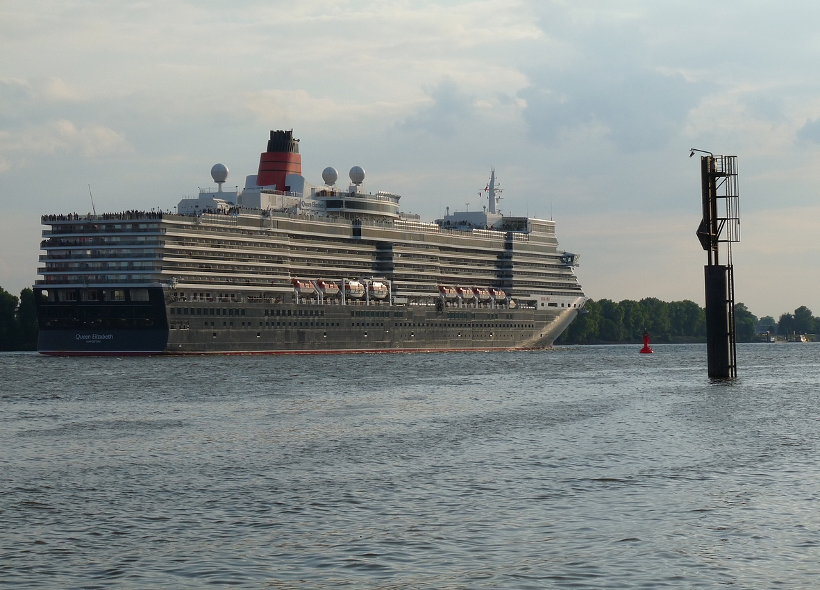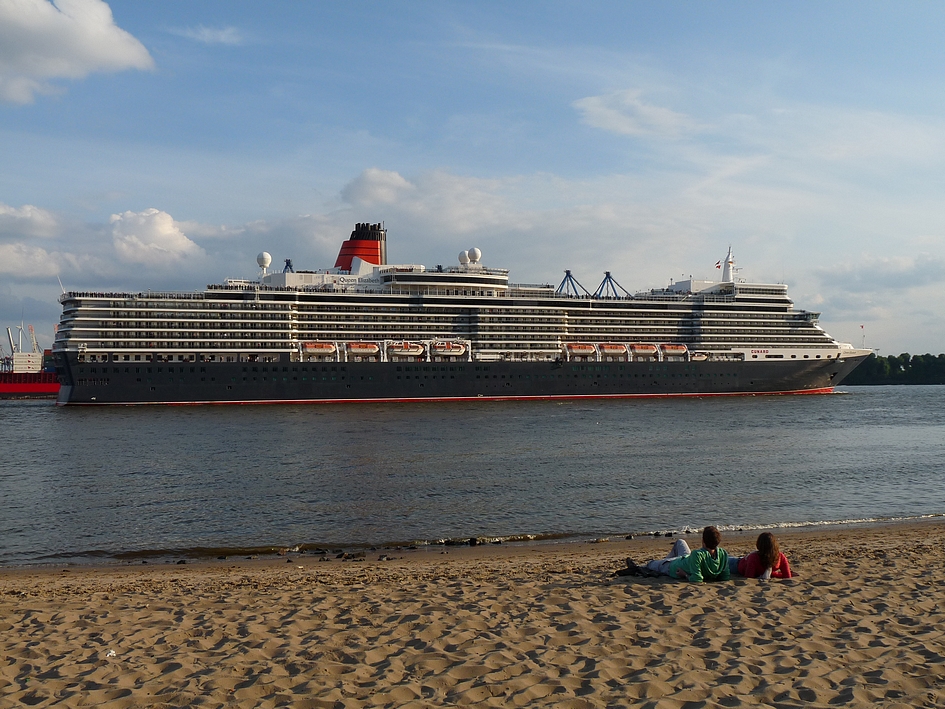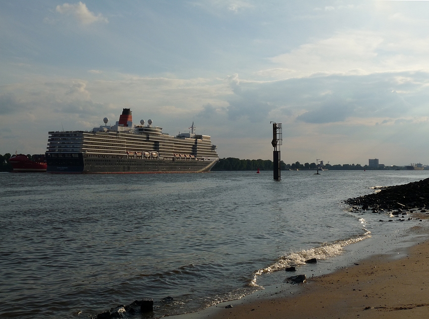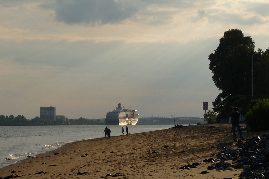 After an afternoon on the Altonale, one of the largest street festivals in Hamburg, I went for a leisure walk down to the beach and the old captains's house of Oevelgoenne to recover from the crowds of people. I had just reached the path that is lining some of the cosiest dwellings (at least it looks like it from outside) our city has to offer, when suddenly a loud foghorn announced the arrival of a huge ship I turned and blinked. And blinked again. The bow of the Queen Elisabeth glided into my view. I was completely take by surprise. I hadn't even known the ship was in town. I got my camera out and jumped down to the beach. This little slide show is the result of this incident.
