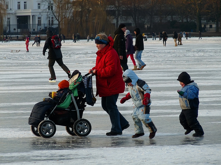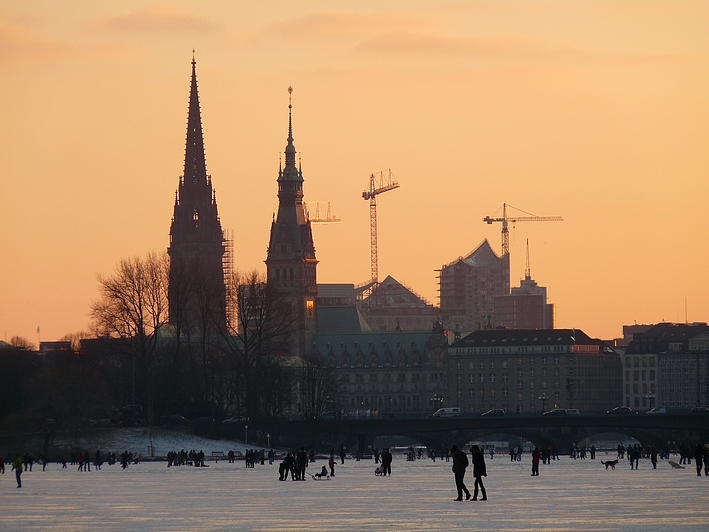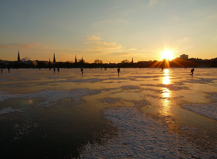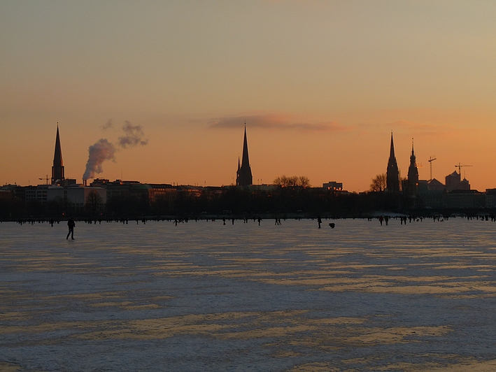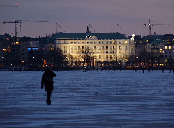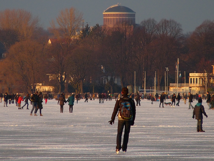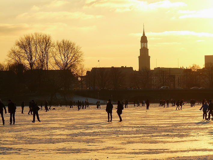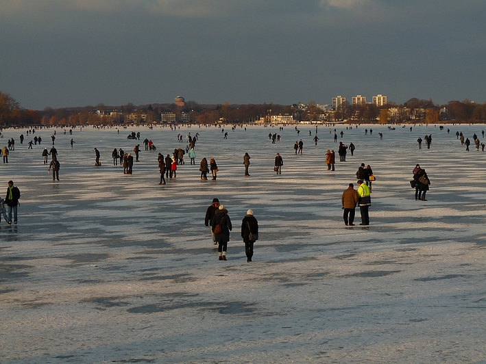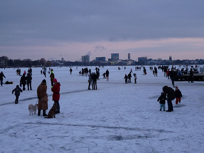 Already on Monday the authorities announced that the ice of the Alster thick enough to go onto the lake on your risk. In general the thickness lay between 14 to 18 cm but at the navigation channels of the Alster ships and at the eastern shore it was only 8 to 10 cm and people were asked to be careful. However two additional frosty days raised hope in the heart of Hamburg's citizens.
