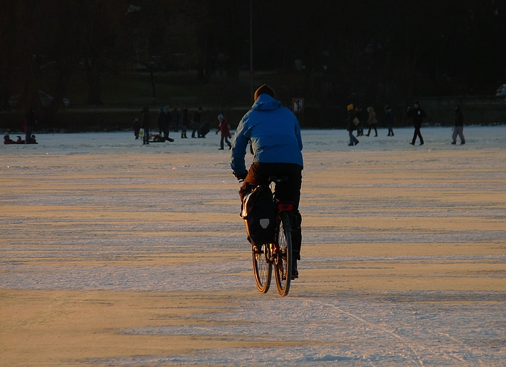 Numerous people were walking across the ice, but compared to the ant hill that is expected on Saturday and Sunday it was nearly empty. Many people were skating, others pushing their baby buggy. Lots were just strolling and a few even cycling over the polished surface. Only little snow covered the for we have had decent cold temperature but hardly any snow at all these days. It needed just a few minutes on the ice until the child in each man and woman was awakened. No matter what age children, adults and pensioneers were slithering forwards, many of them taking a run-up. I enjoyed the bubbling laughter, stopped to watch some ice hockey players, listened to some music coming from a distant café.