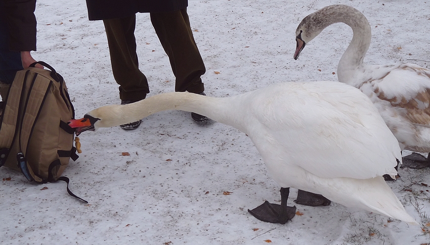 The swans were doubtlessly trained pickpockets who did not hesitate a minute when it came to putting their bills into our coat pockets and bags in search for goodies.
