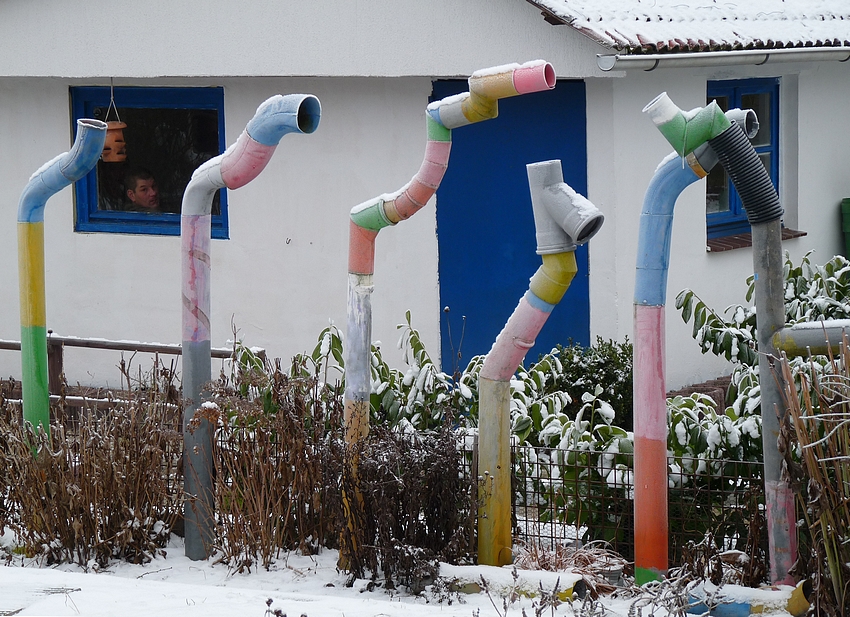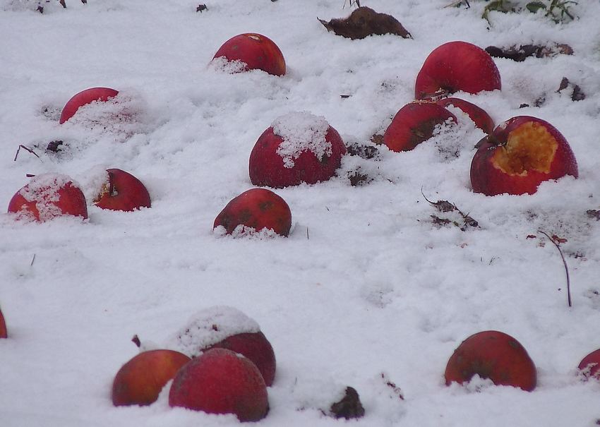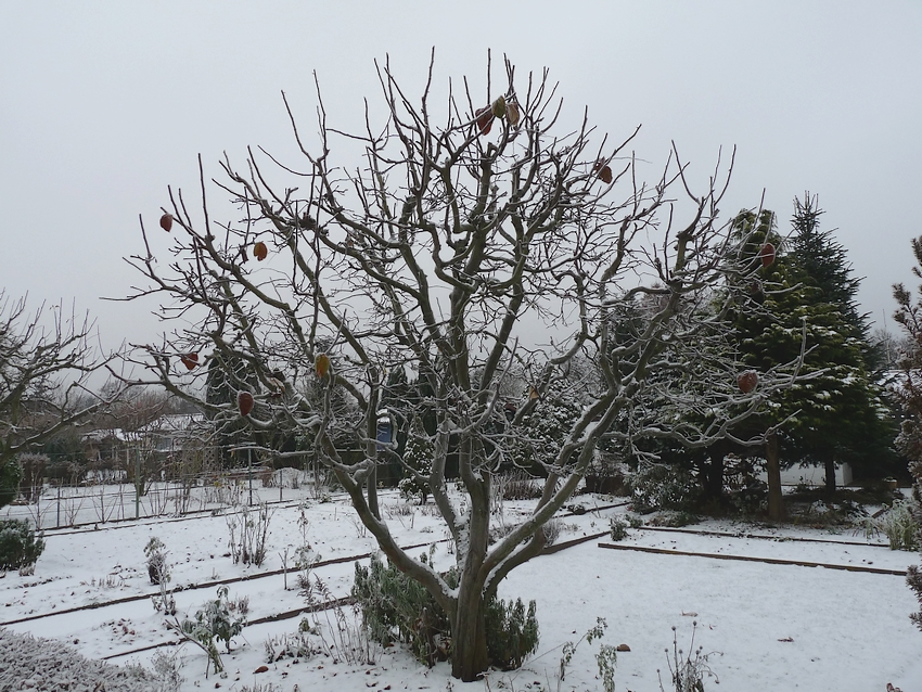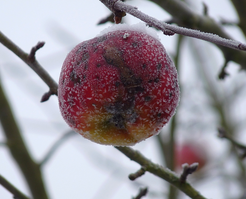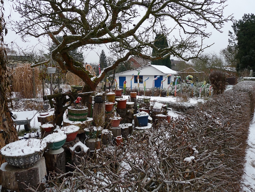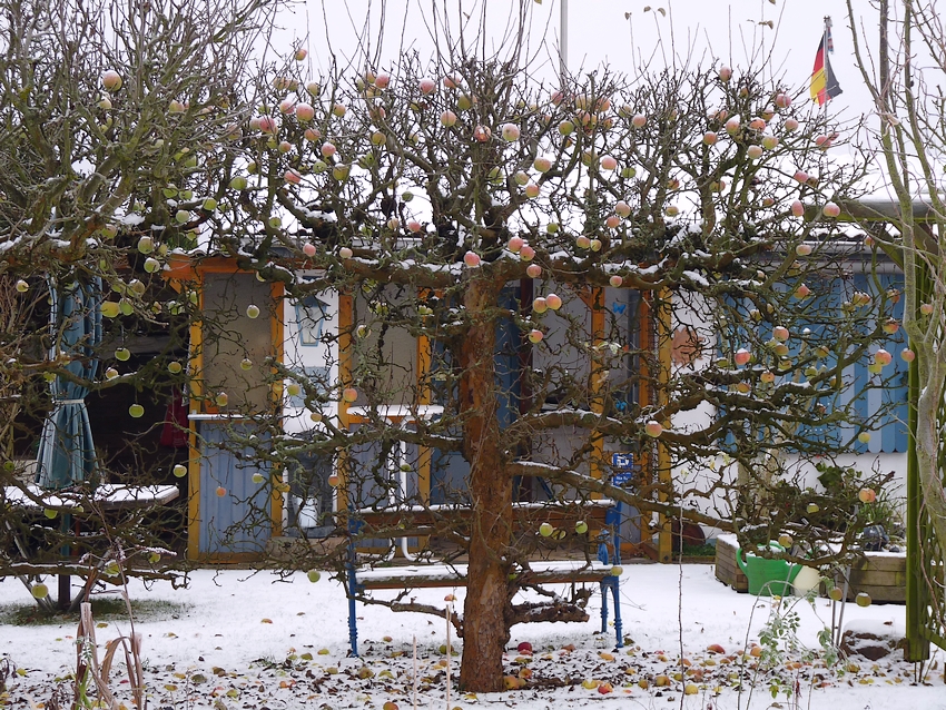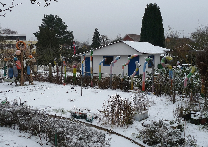 Our path led through colony gardens, which were a haven of winter impressions. Daintily frozen leaves, iced-over apples, glazed rose blossoms, the last survivors of the season. Tiny cabins, garden deco sometime queer competed for our attention.