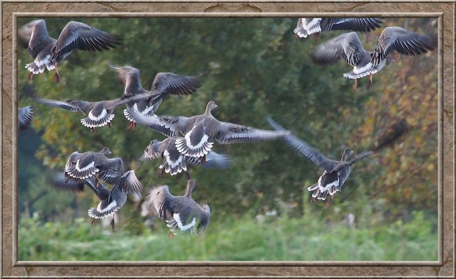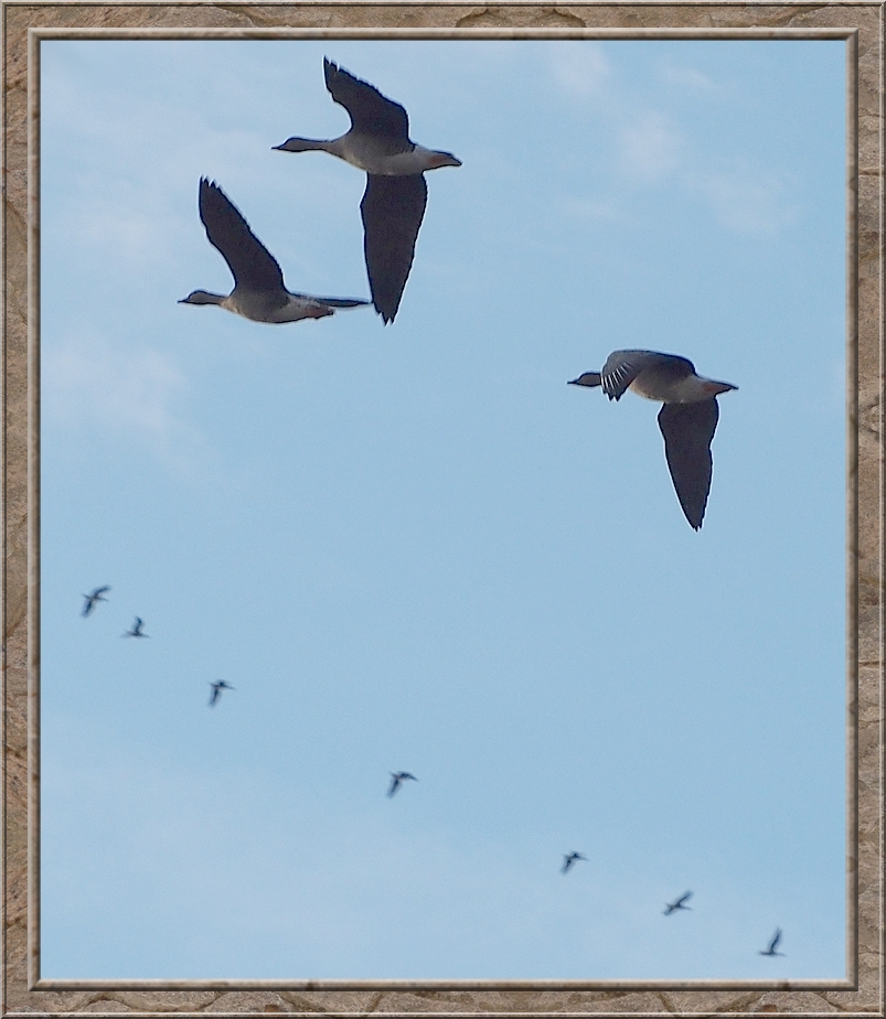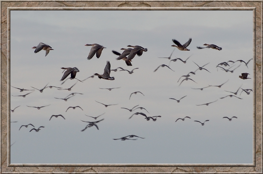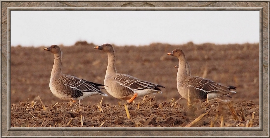 The autumn air was tickling in my nose when I stepped out of the train at Neetzendorf. There was no station building. Only a dirt plattform and a shelter next to a country lane that led to the little village Neetzendorf. I pryed across the acres next to the train station looking for cranes and other migrating birds, but the fields were quiet. However when I walked down the lane I heard the gaggling of gees and saw flocks of them flying through the morning sky. I followed there direction and found them on a nearby harvested acre. The sun was just rising above the tree line while bunches of bean geese and white fronted geese rested on the ground. Once a while a new flock arrived. When I walked along the boundary of the field to watch the birds. Just when I had passed the whole lot of them and reached the whole field of geese seemed to take off into the sky and headed south. Afterwards I saw other flock flying past me, but none stopped. They were journeying to warmer climate.