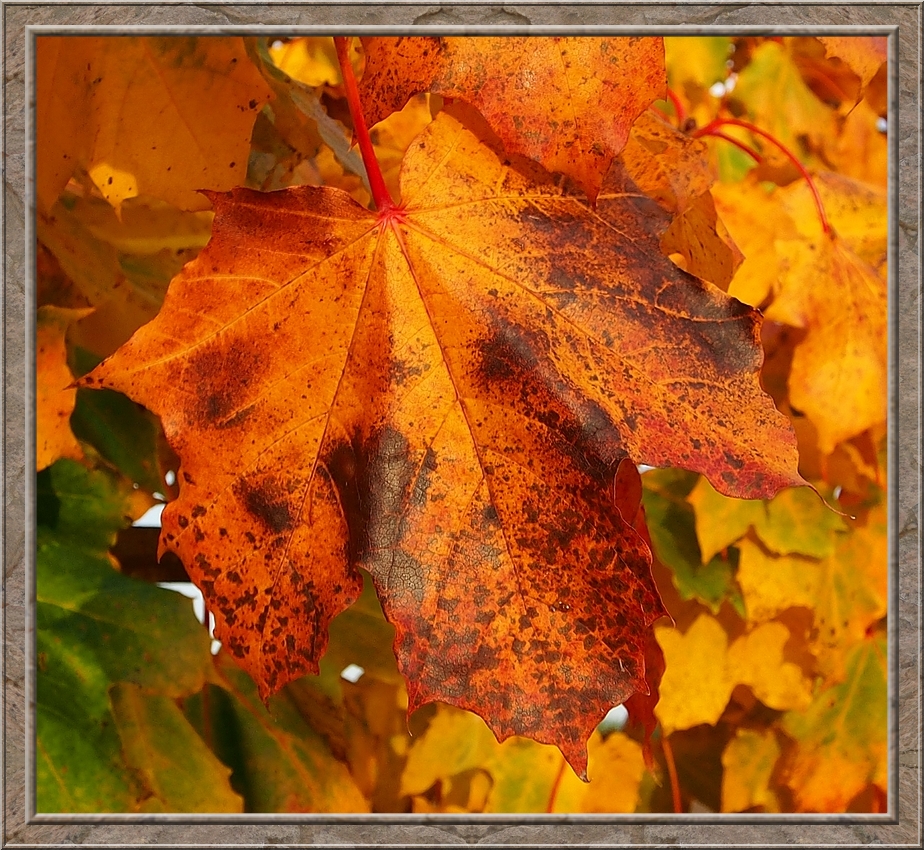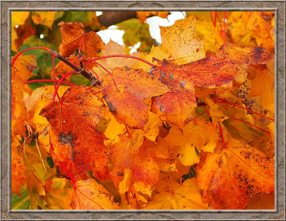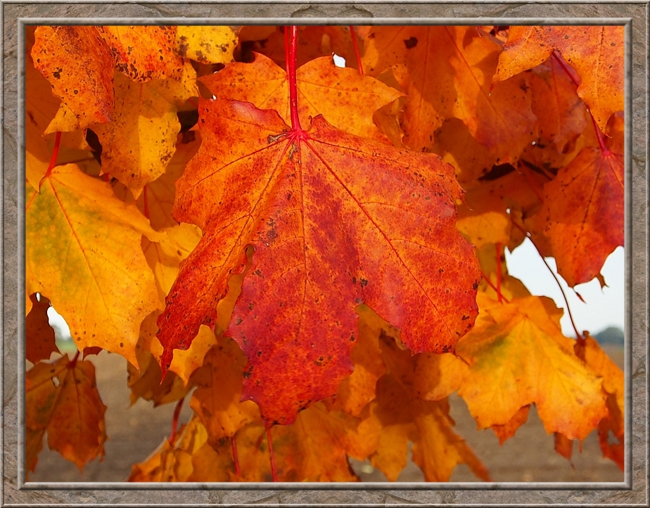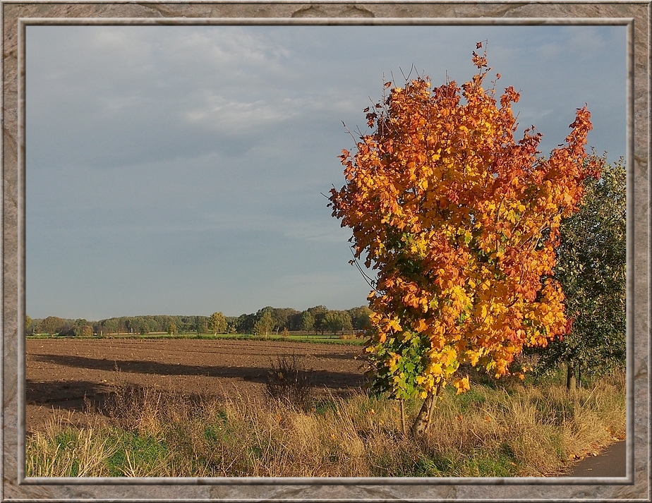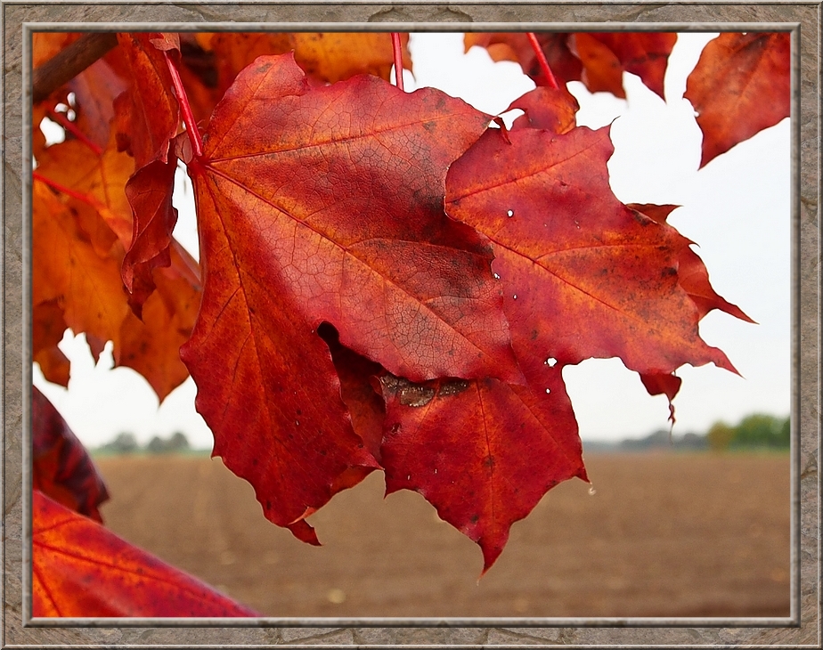 A thick cloud of smoke wafted through the air. A farmer making a bonfire from leaves and other things he wanted to burn. A field of withering sunflowers on my right hand side. After the geese left I returned to the village. I rejoiced in the colourful foliage of maple, oak and fruit trees. Red, gold, brown and still some intense green.