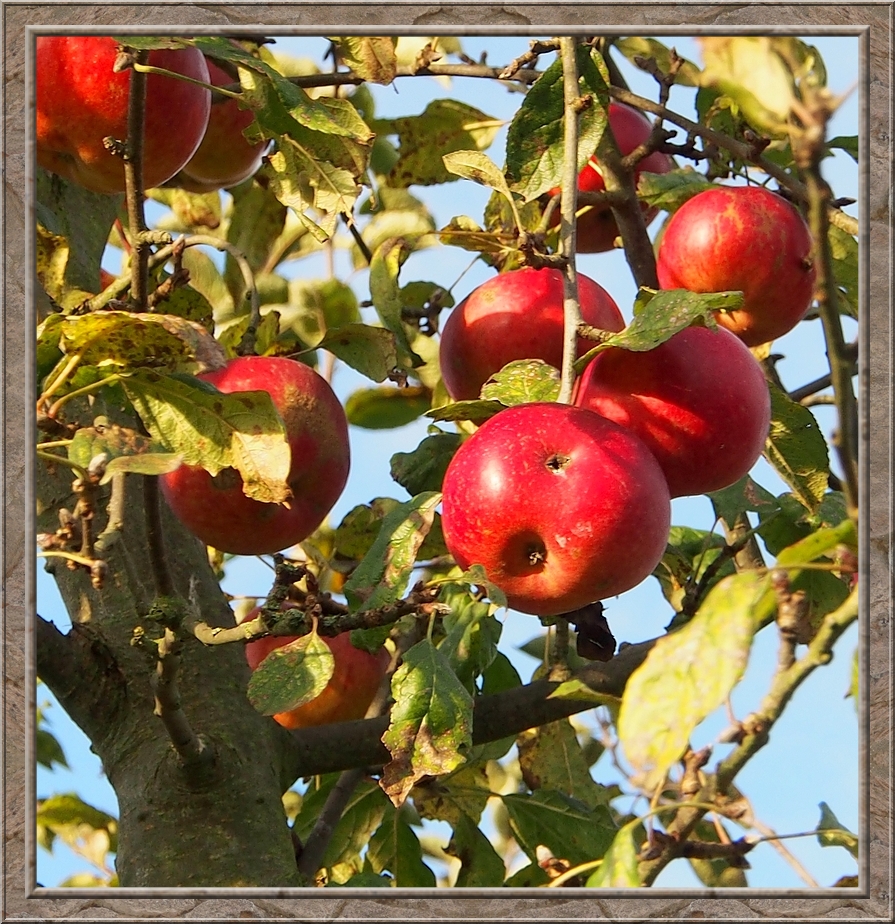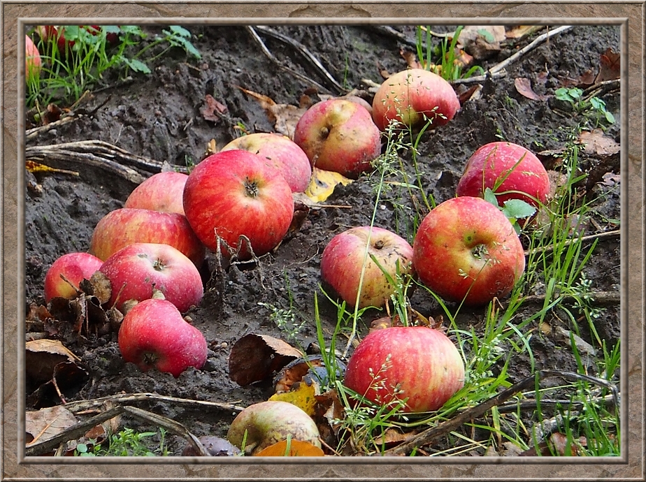 Shining red apples hanging from trees. It was hard to resist there delicious deep red shape. Bunches of fallen apples moulding on the ground. The village contained hardly more than ten farm houses. I passed a woman pushing a wheelbarrow before turning into a track road at the edge of the forest. It was quiet. Only a few birds were singing.