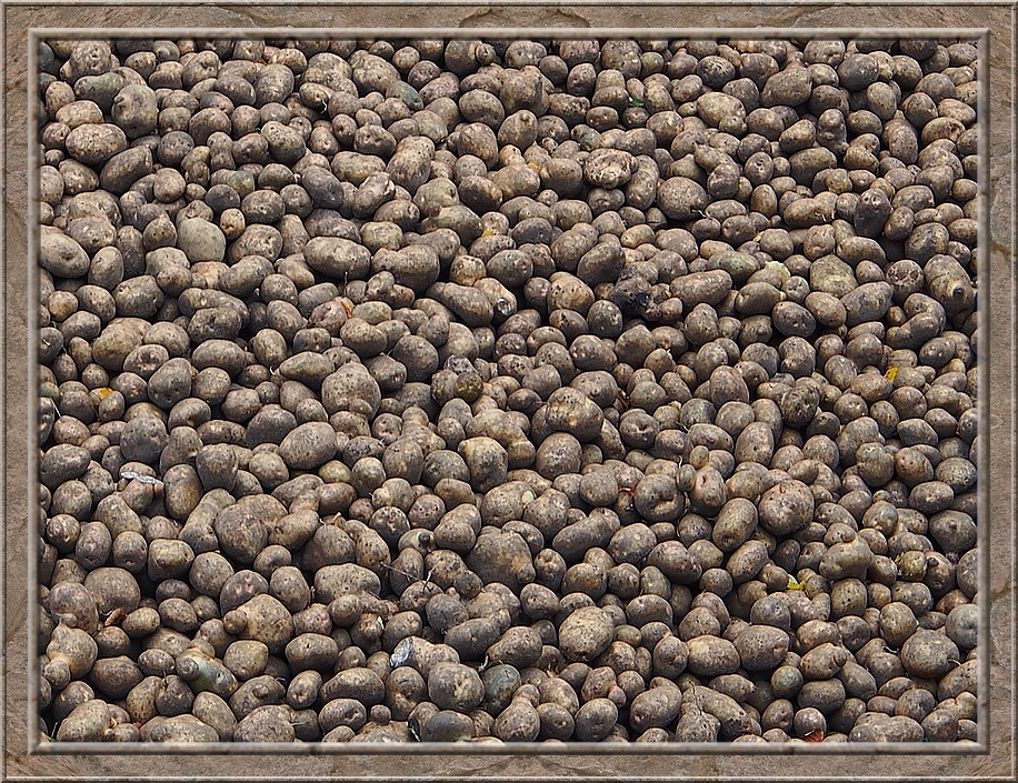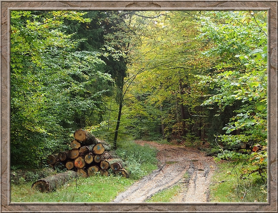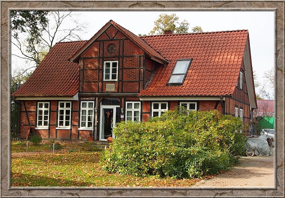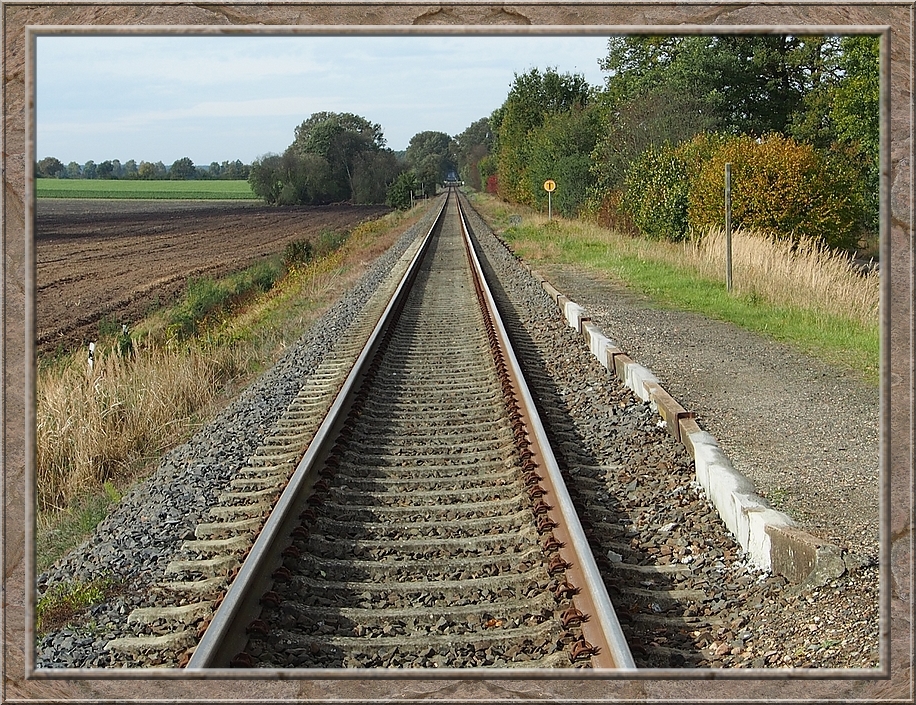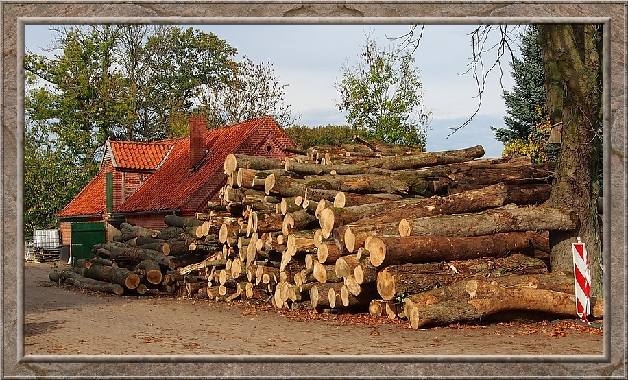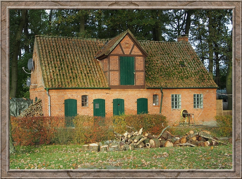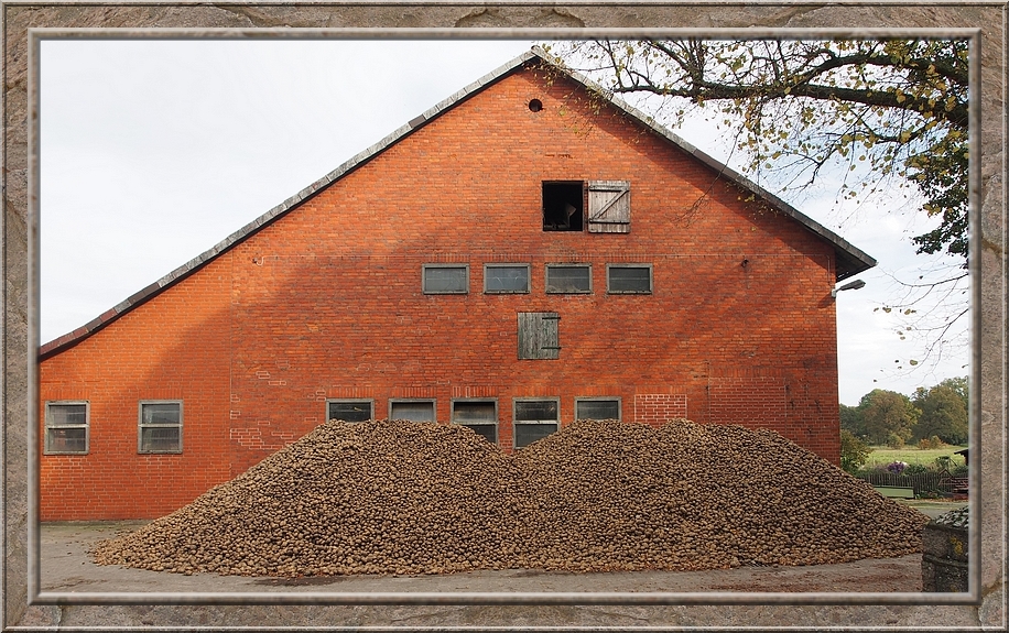 On the other side of the railway tracks the track led to the estate Sueschendorf. I passed buildings which nowadays accomodate families, an osteopath and other small businesses. As I came to the path that headed back to Neetzendorf a young fallow stag crossed the trail ahead of me. He was gone as soon as I spotted him. I did not even hear the sound of his hooves. He passed in total silence....like a gost. There was no sign of him, when I reached the place where I saw him just three minutes later. After a quater of an hour I reached Neetzendorf again. A few cars passed me by. Probably people that returned from their Saturday shopping at the nearest town. On my way back to the railway plattform I passed a farm where a huge hill of potatoes were piling up in front of the barn. Finally I left the last half timbered house behind me and reached the shelter, where I could rest my feet. I only needed to wait a couple of minutes before the train to Lueneburg picked me up. Through the window I saw the country side passing by. Finally we reached the border of Hamburg and crossed the river Elbe. I always enjoy the sight of the port with its huge cranes and container ships, when I am returning home from Lower Saxony. Its an impressive sight.