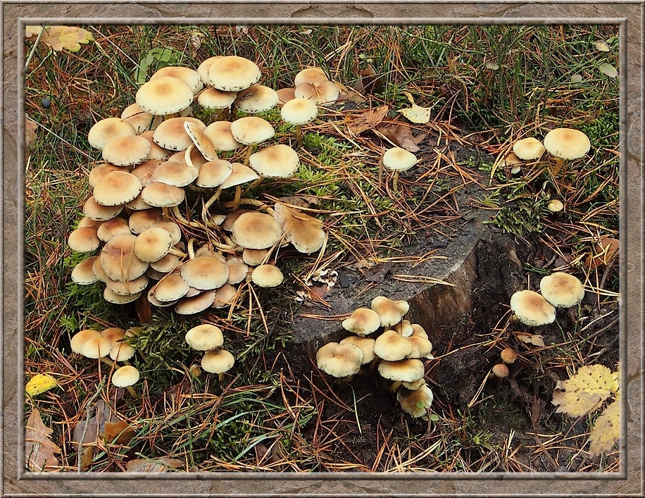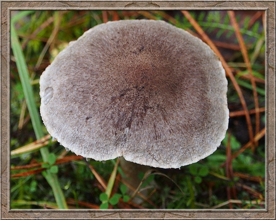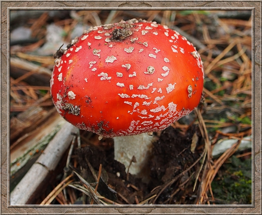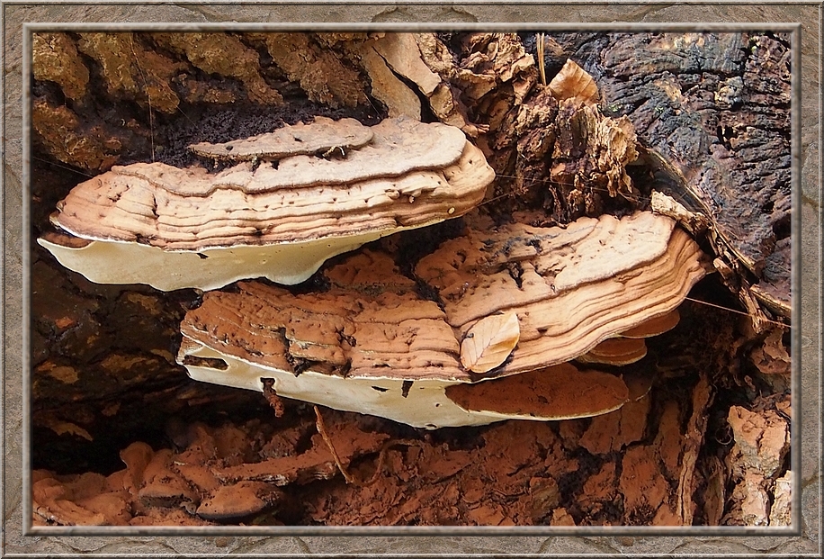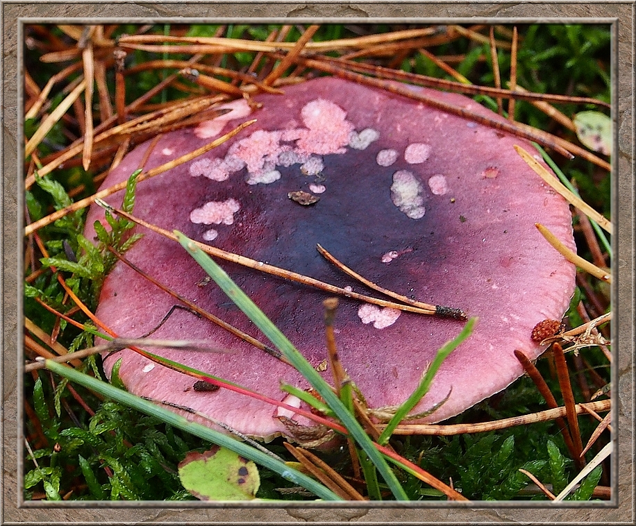 There were giant mushrooms and small ones, all shades of brown, whitish, orange, purple, red with and without white dots. Hats up like somebreros or down like bobble caps. They were growing on the ground, on stumps and rotting logs. Each time I turned my head I seemed to discover a new species.