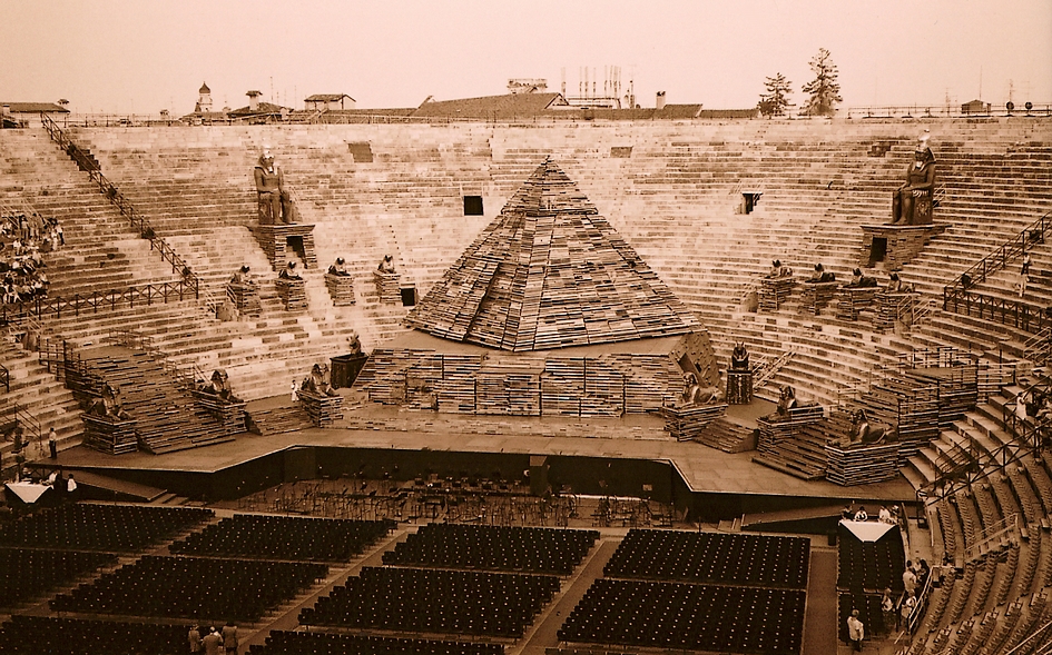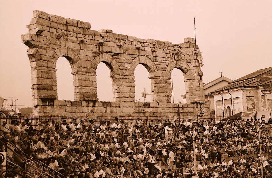 We searched a place high up as there is more air circulation. Then we digged our pillows out of our back packs and watched an endless stream of people starting to fill the auditorium. Two hours were left till the opera should start, but we didn't get bored. There was so much to see. We admired the breathtaking stage, the architecture, the hustle and bustle of human beings, the vendors selling ice-cream, pillows, beverages. Meanwhile the sun lowered and we could admire a gorgeous sunset from our "eagle nest". Night fell in and a full moon rose above the stage. Half an hour before the opera should start the audience with numbered seats at the arena's bottom started to appear. The the first tones of the overture rose to the sky and hushed the voices. A night at the Verona Festival is unforgettable.